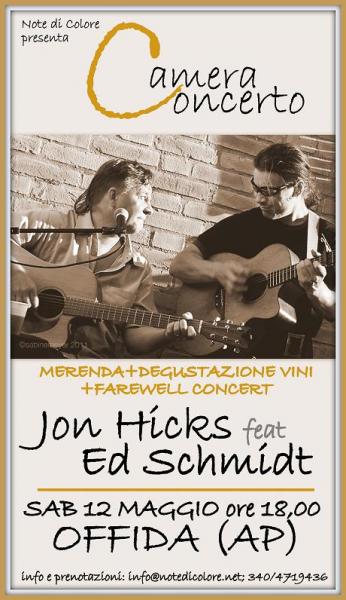 Gli habituè di Camera Concerto conoscono già Jon Hicks e Ed Schmid, ma stavolta sarà diverso: un vero e proprio concerto d'addio (speriamo sia un arrivederci, anzi ne siamo sicuri) di Jon che poi ripartirà come sempre verso nuove avventure, lui è un viaggiatore doc! Insieme sono uno strepitoso duo internazionale di chitarre che spazia dalle ballate orecchiabili e amichevoli, ai ritmi più scatenati e coinvolgenti delle danze popolari irlandesi, qualche brano dal sapore politico, altri che evocano i Bob Dylan d'antan, altri ancora che risentono della loro vita viaggiante; tutte comunque profondamente artigianali, lontane dall'industria della musica, che Ed & Jon detestano.