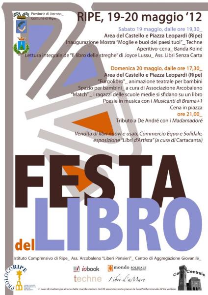 Per quanto riguarda la domenica si inizia dalle 17.30 con il "FurgoLibro" che farà animazione per bambini, di seguito avremo la finale di "Match", un gioco in cui i ragazzi delle scuole medie di Ripe si sfidano su un libro; a seguire, poesia e musica con "I musicanti di Brema +1" e la speciale "Cena letteraria" in Piazza Leopardi. Dalle 21, partirà il concerto-tributo a De André con i Madamadoré.