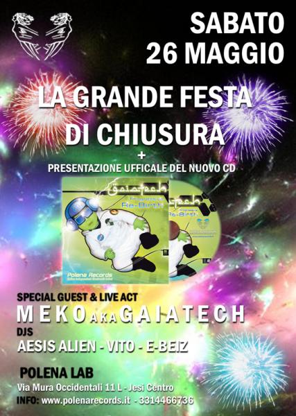 E' in arrivo l'estate e questa prima stagione giunge al termine... siamo arrivati al momento dei saluti, per ritrovarci piu carichi che mai ad ottobre con grandi novità. Quest'ultima serata coinciderà con il Palio di S. Floriano e per l'occasione, visto che il 18 maggio è uscito in tutti i migliori negozi di musica digitale e non, distribuito da Arabesque Distribution Ltd (UK), il primo album in formato cd dell'artista della Polena Records Gaiatech, conosciuto ai piu come Meko Dj, verrà appunto presentato "Progressive Re-Birth", un viaggio all'interno delle sonorità elettroniche in chiave progressive, con influenze reggae/dub & minimal/techno, profondi bassi e grandi sinth, e voci dub... un must per ogni cultore musicale, ottimo da ascoltare in macchina durante un viaggio!