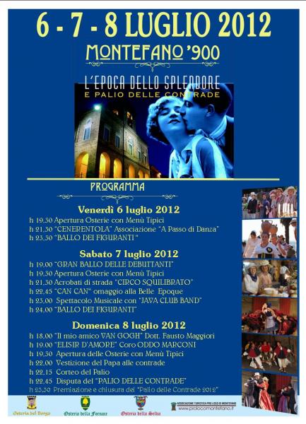 Rievocazione storica ambientata nei primi del '900, il periodo del massimo splendore del nostro Comune. Figuranti in abiti del '900, spettacoli di acrobati e un omaggio alla Belle Epoque con le ballerine di Can Can faranno da splendida cornice dal 6 al 8 luglio nel centro storico di Montefano. Sarà inoltre possibile cenare degustando i piatti tipici nelle tre osterie rionali.