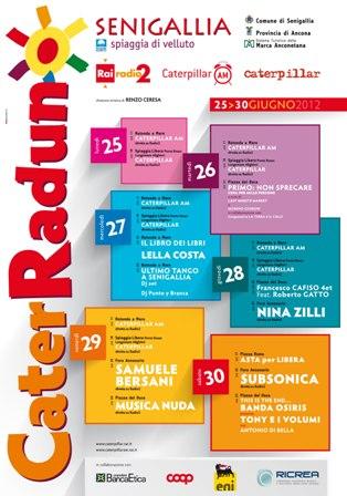 Il CaterRaduno torna a Senigallia dal 25 al 30 giugno con una miscela esplosiva di musica, concerti, informazione ed umorismo. Il solidalizio tra la trasmissione radiofonica Catepillar e Senigallia, arrivato al settimo anno, si arricchisce di alcune importanti novità. Il CaterRaduno 2012, infatti, è il primo dell'era Caterpillar AM, in onda sempre su Radio 2, la mattina, con Filippo Solibello, Benedetta Tobagi, Marco Ardemagni e Cinzia Poli, mentre nella storica fascia pomeridana, insieme a Massimo Cirri ci sono il direttore Antonio Di Bella e Paolo Maggioni.