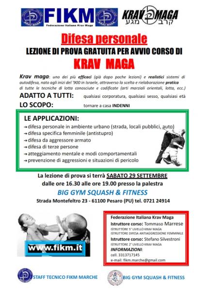 Sabato 29 settembre dalle ore 16.30 alle ore 19.00, presso la Palestra Big Gym Squash & Fitness di Pesaro - Strada Montefeltro 23, si terrà una lezione di prova, gratuita, di difesa personale con sistema Krav Maga per avvio nuovo corso.