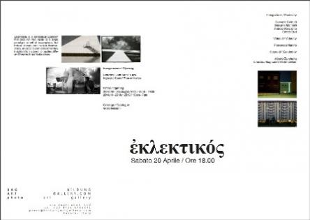 Il progetto espositivo “εκλεκτικ?ς – la nuova sintesi” fa riferimento all’analisi e alla visione offerte dalla fotografia, attraverso un percorso concettuale che si snoda attraverso le opere dei cinque artisti presenti in mostra, testimoniando la varietà delle visioni, degli stili e delle teorie che contraddistingue ciascuno di loro; l’unicum che ne fuoriesce è una sofisticata ed approfondita incursione sovrastrutturale rispetto all’elemento architettonico dato.Inaugurazione sabato 20 aprile 2013, alle ore 18.00.I curatori, Magnanelli Christina Weitensfelder e Alberto Zanchetta invitano a visitare il percorso espositivo, composto di opere fotografiche e video che sono accumunate “dall’assoluta fermezza dello scatto nei confronti dell’arresto temporale”.