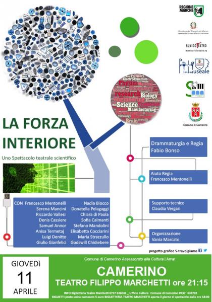 BIGLIETTI POSTO UNICO NUMERATO 5 €. INFO: Biglietteria Teatro Marchetti 0737 636041 _ Ufficio Cultura Comune di Camerino 0737 634702. BIGLIETTERIA TEATRO: Aperta il giorno dello spettacolo dalle ore 18:00. LA FORZA INTERIORE La scienza e i giovani in equilibrio tra avanguardia e tradizione - Spettacolo teatrale scientifico. Progetto di produzione teatrale di Ruvidoteatro in collaborazione con Polo Museale Unicam e Assessorato alla Cultura Comune di Camerino.