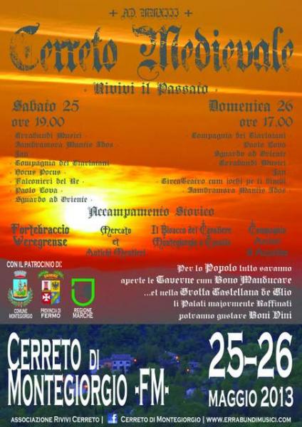Il 25 e 26 Maggio nell'antico borgo di Cerreto di Montegiorgio, si svolgerà la terza edizione di: CERRETO MEDIEVALE. Una rievocazione storica che vede la partecipazione di artisti provenienti da ogni parte d'Italia per far rivivere le atmosfere di epoche lontane. Musici, giocolieri, danzatrici, falconieri, mangiafuoco, riproporranno le figure tipiche del Medioevo. Verranno inoltre riproposte scene di vita quotidiana con l'allestimento di un accampamento storico, con armigeri e tiratori d'arco insieme ad uno spazio per il mercato e gli antichi mestieri. Nelle taverne i visitatori potranno degustare cibi e bevande. Bus navetta gratuito.