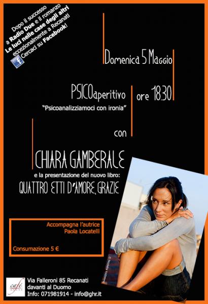 Psico-Aperitivo con Chiara Gamberale al Cafè Opera, ore 18.30e presentazione del nuovo libro "Quattro etti d'amore, grazie" (ed. Mondadori, 2012)accompagna l'autrice Paola LocatelliCafè Opera, Via Falleroni - RecanatiINFO: 071981914 - info@ghr.it(https://www.facebook.com/livejazzclub?fref=ts)------------------------------------------------Chiara Gamberale ha condotto dal 2010 al 2012 una trasmissione su Radio Due intitolata " Io Chiara e L'Oscuro". Ogni giorno Testa, Cuore, Corpo e Chiara scandagliavano vari temi. Era una sorta di psico-seduta collettiva. Il 5 maggio vogliamo proporre una specie di psico-incontro recanatese, con aperitivo e presentazione del nuovo libro dell'autrice, intitolato: "Quattro etti d'amore, grazie" (ed. Mondadori, 2013. disponibile anche come e-book)Per chi volesse saperne di più questi sono i link della trasmissione, su fb (https://www.facebook.com/iochiaraeloscuro.radio2?fref=ts) e sul web (http://www.radio.rai.it/radio2/iochiaraeloscuro/)Chiara Gamberale (https://www.facebook.com/Gamberale.Chiara?fref=ts) torna ad ammaliare i lettori dopo l'internazionale successo di "Le luci nelle case degli altri" (ed. Mondadori, 2010), romanzo che, appunto, è stato tradotto in numerose lingue.------------------------------------------------costo dell'aperitivo 5€