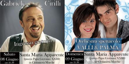 La Festa si svolge dal 31 maggio al 10 giugno in onore della Maddonna copatrona della città di Civitanova Marche. Ogni serata c'è un evento diverso (che potete trovare sul sito www.santamariaapparente.com) che si conclude con lo spettacolo di GABRIELE CIRILLI (sabato 8) e l'orchestra spettacolo VALLY & PALMA (DOMENICA 9) con la registrazione della trasmissione di TVRS de "LA NOSTRA GENTE"