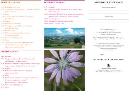 “LEGGERE NEL LIBRO DELLA NATURA” IV° Corso teorico pratico di osservazione della natura 14 – 16 giugno 2013 Albergo Oasi San Benedetto Lamoli di Borgo Pace (PU) La quarta edizione del corso di osservazione della natura è dedicata alla pratica della percezione e dell'osservazione di piante e paesaggio, nella loro relazione con l'uomo, la cultura e i ritmi della natura: “L’incontro vorrebbe stimolare una nuova attenzione per i fenomeni della natura, da un lato per le peculiarità del paesaggio e dall’altro per la vita delle piante. Si cercherà insieme un sano respiro fra momenti di concentrazione e di studio e momenti di apertura alla ricca fenomenologia della natura, attraverso conferenze, laboratori all'aperto e esercitazioni artistiche.” Il corso è aperto a tutti, principianti ed esperti. Come relatori intervengono Stefano Pederiva, Giorgio Bortolussi, Karin Mecozzi, Daniela Dall'Oro e Rita Bubenhofer, in collaborazione con Sezione Marche Associazione Agricoltura Biodinamica, il “Gruppo di lavoro sulla conoscenza della Natura” e Accademia Europea per la cultura del paesaggio PETRARCA.