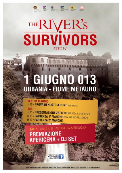 Manifestazione degli Zatteroni lungo il fiume METAURO IV° edizione 2013 La “Manifestazione degli zatteroni lungo il fiume Metauro” è una manifestazione ludico-sportiva organizzata per la valorizzazione e la riscoperta del nostro fiume. L’intento è quello di trascorrere una piacevole giornata all’insegna del sano divertimento e del corretto spirito agonistico alla riscoperta di un ambiente naturale ancora assolutamente vivibile. La manifestazione è organizzata dal Comune di Urbania con la collaborazione della Provincia di Pesaro e Urbino, della Proloco Giovani. le zattere dovranno essere presentate e parcheggiate in piazza San Cristoforo davanti al teatro il sabato 1 giugno 2013 alle ore 11.00. In tale contesto si provvederà, mediante estrazione a sorte, alla definizione dell’ordine di partenza degli equipaggi. Alle ore 16.00 le zattere dovranno essere parcheggiate all’interno dell’area di partenza della gara, Le iscrizioni saranno raccolte presso l’ufficio Turismo di Urbania fino al 26 maggio 2011, Corso Vittorio Emanuele, 21 - Tel. 0722 313140 Fax 0722 313179 o via mail vicesindaco@comune.urbania.ps.it : dal lunedì al venerdì dalle ore 09,00 alle ore 13,00; anche di pomeriggio il giovedì e il sabato dalle 15.00 alle 18.00.trovate tutto sul sito del Comune di urbania : http://www.comune.urbania.ps.it/images/ultime_novita/RIVER_loc2013-bassa.pdf e facebook : http://www.facebook.com/#!/events/169571999874521/?fref=ts