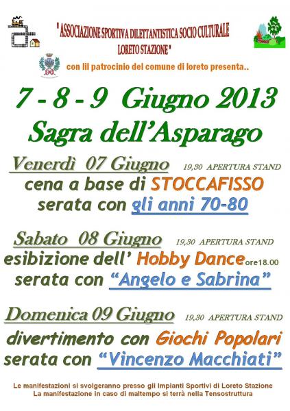 7 - 8 - 9 Giugno 2013 Sagra dell’AsparagoVenerdì 07 Giugno: 19,30 APERTURA STAND, cena a base di STOCCAFISSO; serata anni '70 / '80Sabato 08 Giugno: 19,30 APERTURA STAND, esibizione dell’Hobby Dance ore18.00; serata con“Angelo e Sabrina”Domenica 09 Giugno: 19,30 APERTURA STAND, divertimento con Giochi Popolari; serata con “Vincenzo Macchiati”Le manifestazioni si svolgeranno presso gli Impianti Sportivi di Loreto Stazione.La manifestazione in caso di maltempo si terrà nella tensostruttura.