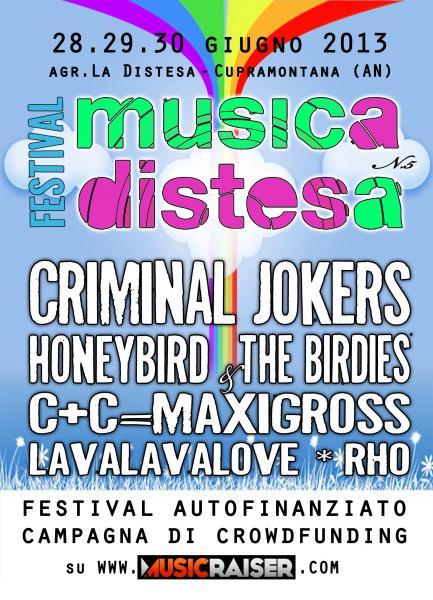 Torna il Festival della Buona Musica e del Buon Vino, Musica Distesa.Il 28, 29 e 30 giugno 2013 si ricomincia con tre giorni di concerti, dj set, mostre, incontri, degustazioni, buon cibo.Il tutto nel contesto magico de La Distesa, l'agriturismo e azienda vinicola situata in mezzo alla natura di Cupramontana, nei Castelli di Jesi, provincia di Ancona.La più grossa novità dell'edizione 2013 è la partenza della campagna di autofinanziamento, attiva su Musicraiser, che attraverso l'offerta di diverse ricompense permetterà a Musica Distesa di proseguire nel suo scopo unicamente culturale.1) Segui il link http://www.musicraiser.com/it/projects/962-festival-musica-distesa-20132) Scegli la tua ricompensa3) Diventa coproduttore del FestivalRestano pochi giorni, FACCIAMOLO!