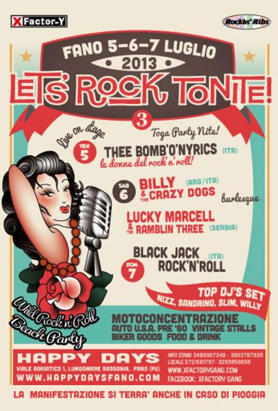 CE L’ABBIAMO FATTA E’ IN ARRIVO UN NUOVO LET’S ROCK TONITE 2013!!WILD ROCK’N'ROLL PARTY ON THE BEACH!!GO CAT GO!!L’XFACTORY BOLOGNA E I ROCKIN’ RIBS DI FANO SONO RIUSCITI AD ORGANIZZARE IL 3° LET’S ROCK TONITE!!UNA NUOVA BELLISSIMA E CENTRALE LOCATION SUL LUNGOMARE DI FANO OSPITERA’ TUTTI I ROCKERS,BIKERS E RODDERS CHE SARANNO COME SEMPRE I BENVENUTI!!BAND INTERNAZIONALI E NAZIONALI,BURLESQUE PERFORMER,I DJ,IL NOSTRO TOGA PARTY,MOTOCICLETTE E AUTO AMERICANE FARANNO PARTE DI UNA TRE GIORNI DI SCOPPIETTANTE ROCK’N'ROLL!!!VI ASPETTIAMO ROCKEGGIANDO COME SEMPRE!———-GOOD ROCKIN’ & BE KOOL!!———-BANDS:?THEE BOMB’O'NYRICS (ITA)?BILLY & THE CRAZY DOGS (ARG/ITA)?LUCKY MARCELL & THE RAMBLIN’ THREE (SERBIA)?BLACK JACK ROCK’N'ROLL (ITA)DJS:?ANDY LEE,NIZZ,SANDRINO,SLIM,WILLYBURLESQUE SHOW:?ARTISIA STARLIGHT___________PROGRAMMA____________VENERDI 5 LUGLIOORE 17.00APERTURA STANDS E RISTORAZIONEORE 17.00/22.30DJ RECORD HOP: ANDY LEE,NIZZ,WILLYORE 22.30???? TOGA PARTY NITE! ????ORE 22.30/00.30LIVE:????THEE BOMB’O'NYRICS????____LE DONNE DEL ROCK’N'ROLL____ORE 00.30/03.00DJ RECORD HOP: ANDY LEE,SANDRINO,WILLY________________________________________________________________________SABATO 6 LUGLIOORE 17.00APERTURA STANDS E RISTORAZIONEORE 17.00/21.30DJ RECORD HOP: NIZZ,SANDRINO,SLIM,WILLYORE 21.30/23.00LIVE:????BILLY & THE CRAZY DOGS????ORE 23.00/23.45BURLESQUE SHOW: ARTISIA STARLIGHTORE 23.45/01.45LIVE:????LUCKY MARCELL & THE RAMBLIN’ THREE????ORE 01.45/02.00BURLESQUE SHOW: ARTISIA STARLIGHTORE 02.00/04.00DJ RECORD HOP: SANDRINO,NIZZ,WILLY________________________________________________________________________DOMENICA 7 LUGLIOORE 17.00APERTURA STAND E RISTORAZIONEORE 17.00/20.00DJ RECORD HOP: WILLY,SLIMORE 20.00/21.30LIVE????BLACK JACK ROCK’N'ROLL????ORE 21,30/23.00DJ RECORD HOP: SLIM____________________________________SARANNO DISPONIBILI LETTINI DA MARE A 20 METRI DAL LOCALE “HAPPY DAYS”________________________________________________________________________INFO STAND: 3489967349-3803767935HAPPY DAYS: 0721581797-3293856058www.xfactorygang.comwww.happydaysfano.com____________________________________CONVENZIONI ALBERGHIERE:HOTEL: Coming soon.CAMPEGGIO:A 3 KM DAL PARTY CAMPING MADONNA PONTE via delle Brecce 25 (FANO)www.campingmadonnaponte.com____________________________________COME ARRIVARE:Autostrada A14 uscita Fano-poi prendere per Fano centro-seguire sempre le indicazioni per il centro/stazione-alla stazione seguire le indicazioni per il porto.Dalla statale adriatica-sia da Milano che da Pescara-seguire sempre le indicazioni per la stazione e poi per il porto.