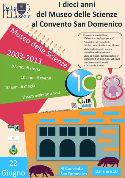In occasione del decennale del Museo delle Scienze dell’Università di Camerino all’interno dell’ex Convento di San Domenico verrà organizzata una Giornata di Studio con il seguente programma: Ore 10.00 Saluto delle Autorità : Università di Camerino, Regione Marche, Soprintendenza per i Beni Archeologici delle Marche, Autorità locali Ore 10.45 Interventi di : Chiara Invernizzi – Direttore Polo Museale Unicam Fausto Barbagli – Presidente dell’ANMS (Associazione Nazionale dei Musei Scientifici) Guglielmo Maglio - Responsabile Aree espositive di Città della Scienza, Napoli Ore 12.00 Presentazione de “L’altopiano degli Ippopotami” (Quaderni del Museo n. 4) a cura di Alessandro Blasetti (Museo delle Scienze – Unicam) e visita guidata al riallestimento della sezione espositiva paleontologica Pomeriggio, dalle ore 15.00: Trasferimento a Serravalle di Chienti e visita a ‘I luoghi dell’ippopotamo’ con sosta presso l’Area espositiva e laboratorio di restauro e breve escursione a Collecurti presso il sito degli scavi paleontologici.