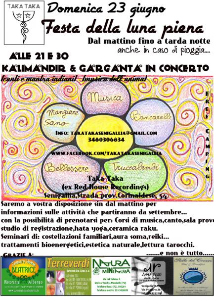 Prima festa di luna piena per inaugurare il Taka Taka...Dal mattino fino a tarda notte...cena/buffet a offerta,mercatini vari e dalle ore 21 e 30 concerti con Kalimandir (canti e mantra indiani) Garganta (musica dell'anima)...nel corso della festa saremo a vostra disposizione sin dal mattino per informazioni sulle attività che partiranno da settembre...con possibilità di prenotarsi per: Corsi di musica,canto,sala prove,studio di registrazione,hata yoga,ceramica raku.