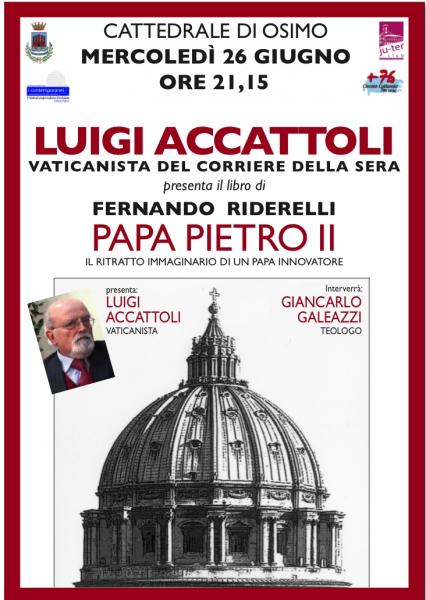 Luigi Accattoli, per oltre tre decenni firma autorevole e prestigiosa del “Corriere della Sera” ove ha ricoperto il ruolo di “Vaticanista”, sarà ad Osimo, mercoledì 26 giugno alle ore 21.15 alla Concattedrale di San Leopardo per presentare l’ultima fatica letteraria del Prof. Fernando Riderelli dal titolo “Papa Pietro II. Il ritratto immaginario di un Papa innovatore” . In questa storia romanza Fernando Riderelli intende rivolgersi a tutti gli uomini di buona volontà, affinché si facciano latori di suggerimenti e iniziative conformi al dettato evangelico. Il suo libro è una biografia romanzata con un linguaggio avvincente e di facile fruizione. Narra la vita di Luca Valeri, il futuro Pietro II, con l’accortezza di privilegiare gli aspetti positivi della vicenda umana del protagonista, lasciando ad altri la morbosità di facili costruzioni da rotocalco. A Riderelli interessa il ripristino della Chiesa secondo gli intendimenti del Suo fondatore, sentendosi egli stesso Chiesa. Inventando la figura di Papa Pietro II (seguendo almeno nel nome la profezia di falsa attribuzione a San Malachia), la biografia si distende, sin dai diciotto anni d’età, all’insegna della chiamata diretta del Signore, come è avvenuto per San Pietro, San Paolo, San Francesco. L’incontro è inserito nella IV edizione della Rassegna Letteraria “I Contemporanei: conversazioni con chi scrive il presente” ideata e curata dal Circolo Culturale JU-TER Club Osimo ed organizzata in sinergia con il “Circolo +76”. Al tavolo dei relatori della conferenza anche un ulteriore gradito ospite, il prof. Giancarlo Galeazzi filosofo e teologo anconetano, cui due anni fa è stata assegnata la cittadinanza onoraria della città dei “senza testa” per “aver contribuito alla valorizzazione della comunità osimana dal punto di vista civile ed ecclesiale.