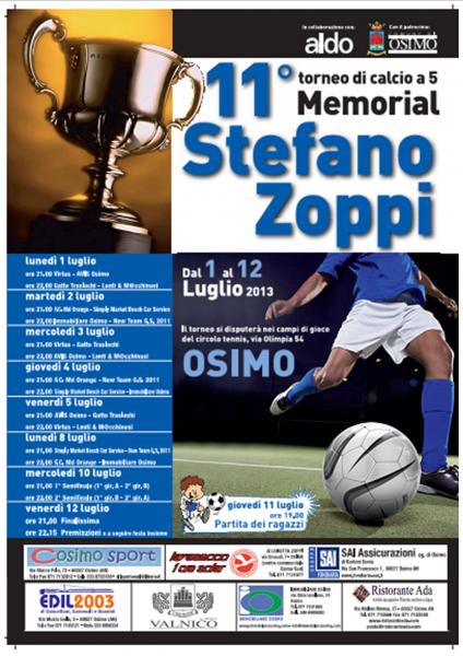 Undicesima edizione del torneo di calcio a 5 "Memorial Stefano Zoppi", organizzato per ricordare un giovane osimano prematuramente scomparso. Si parte alle ore 21.00 del 1° luglio; formula a due gironi con quattro squadre ciascuno. Mercoledì 10 luglio semifinali; giovedì 11 luglio "Partita dei Ragazzi", dedicata ai figli degli organizzatori e loro amici; Venerdì 12 luglio finalissima con premiazioni a seguire e "Festa Insieme", il tradizionale buffet offerto dalla famiglia di Stefano. Un particolare ringraziamento al Comune di Osimo, per il patrocinio alla manifestazione, ed all'AIDO - Gruppo di Osimo, al quale il torneo è profondamente legato nel ricordo del forte gesto della donazione di organi, effettuato dai familiari del ragazzo.