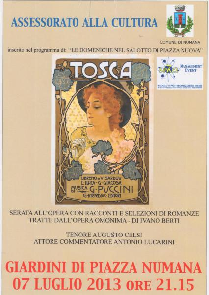 Domenica 7 luglio, per il ciclo "Le Domeniche nel salotto di Piazza Nuova", alle ore 21,15 grande “Serata all’Opera”, con racconti e selezioni di romanze dall’opera “Tosca” di Puccini, a cura di Ivano Berti.
