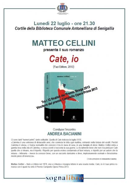 Lunedì 22 luglio alle ore 21.30 sarà ospite nel cortile della Biblioteca Comunale di Senigallia uno dei 12 finalisti al "Premio Strega" e vincitore del "Campiello Opera Prima" 2013, lo scrittore marchigiano Matteo Cellini. In dialogo con lui Andrea Bacianini di LibriSenzaCarta.it. " Matteo Cellini, trentacinquenne di Urbino, ha scritto con 'Cate, io' (Fazi) un romanzo teso e potente, al quale non è estranea la radicalità di Federigo Tozzi e la tensione espressiva di Landolfi (due scrittori citati nel testo). Immaginate il nostro mondo, con il suo culto della fitness, visto da una obesa di diciassette anni. Appena esce di casa la sua identità scompare: non è più Caterina ma Cater-Pillar, Cate-Bomba, Cate-Ciccia, destinata a salvare tutte le altre perché gli toglie dalle mani la palma della più brutta, della più grassa, della più sola…"; " La sua impietosa lucidità, attraverso lo stile limpido e tagliente di Cellini, riesce a rappresentare il disagio più universale di tutti coloro che, grassi o magri che siano, si sentono comunque diversi, esclusi, mai accettati." (dalle lettere di presentazione al "Premio Strega" rispettivamente del critico Filippo La Porta e della scrittrice Paola Mastrocola).