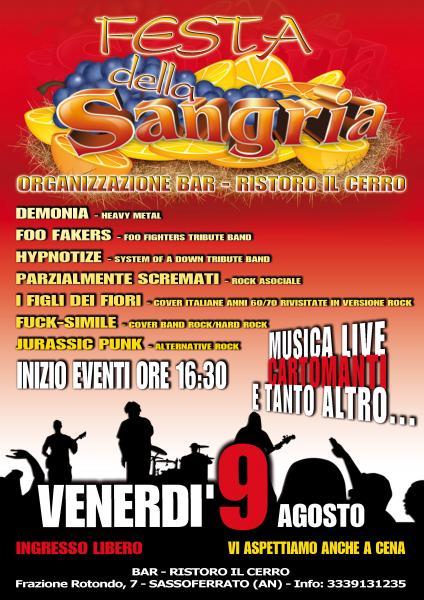 Roy Demon in collaborazione con il Ristoro il Cerro dà vita quest' anno alla prima edizione della Festa della Sangria. La festa si svolgerà all'aperto con possibilità di acquisti e di Cartomanti che leggeranno il vostro futuro. POSSIBILITA' DI CENARE NELLA LOCATION I gruppi: DEMONIA- Heavy Metal FOO FAKERS-Foo Fighters tribute band PARZIALMENTE SCREMATI- Rock Asociale I FIGLI DEI FIORI- Cover italiane anni 60/70 rivisitate Rock FUCK-SIMILE- Cove Band Rock-hard rock JURASSIK PUNK- Alternative rock ----ATTENZIONE---- PANINO CON SALSICCIA + BIRRA 5 EURO MEGA SPAGHETTATA DI MEZZANOTTE!!!!!!!!!!! INFO- 3339131235--3279380798
