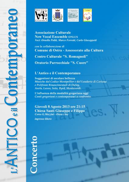 Molti i concerti del New Vocal Ensemble in questi primi quindici giorni di agosto. Lunedì 5 e Martedì 6 agosto 2013 nella Chiesa della Maddalena in Senigallia, saranno di scena i Concerti "a Lume di Candela" organizzati con il sostegno e la collaborazione di CSV Marche - Centro Servizi per il Volontariato e Vespero. Un doppio appuntamento dedicato ai lavori sacri del compositore e direttore senigalliese Marco Ferretti, che presenterà un percorso d'ascolto attraverso quattro diversi momenti musicali. L'ensemble sarà poi impegnato l'8 ad Ostra e l'11 a San Giorgio di Pesaro, per concludere questa calda estata di spettacoli il 15 agosto a Monsano dove, in una nuova e inusuale formazione, presenterà celebri melodie per soprano e pianoforte. Tutte le informazioni su www.marcoferretti.com/newvocalensemble.
