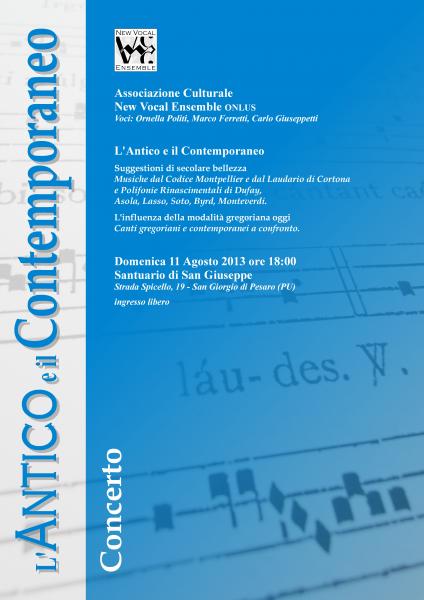 Molti i concerti del New Vocal Ensemble in questi primi quindici giorni di agosto.Lunedì 5 e Martedì 6 agosto 2013 nella Chiesa della Maddalena in Senigallia, saranno di scena i Concerti "a Lume di Candela" organizzati con il sostegno e la collaborazione di CSV Marche - Centro Servizi per il Volontariato e Vespero. Un doppio appuntamento dedicato ai lavori sacri del compositore e direttore senigalliese Marco Ferretti, che presenterà un percorso d'ascolto attraverso quattro diversi momenti musicali. L'ensemble sarà poi impegnato l'8 ad Ostra e l'11 a San Giorgio di Pesaro, per concludere questa calda estata di spettacoli il 15 agosto a Monsano dove, in una nuova e inusuale formazione, presenteràcelebri melodie per soprano e pianoforte. Tutte le informazioni su www.marcoferretti.com/newvocalensemble.