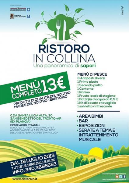 si tratta della promozione e della valorizzazione dei nostri prodotti agro ittici. un posto dove cibo, amicizia e panorama si sposano in un'atmosfera di festa!!! Menù completo di tre antipasti, primo, secondo, contorno, frutta e acqua a soli 13 euro. Non solo cibo, ma esposizioni e una vasta area bimbi con relativo menu bimbi a 7 euro, composto da cotoletta, patatine fritte e bottiglietta d'acqua da 0,5 lt.