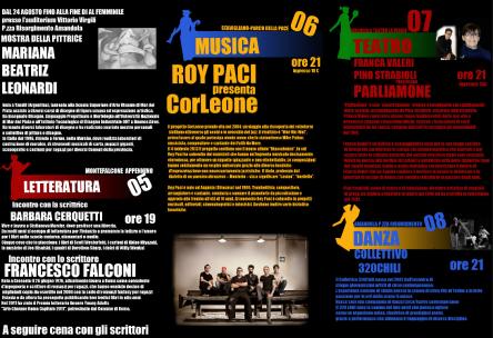 "Al Femminile: la voce, il corpo, la parola" è un progetto dell'associazione teatrale di Amandola "Os Aridum", realizzato insieme alla Fondazione Cassa di Risparmio di Ascoli Piceno. Alla realizzazione del progetto collaborano diverse associazioni del territorio, fornendo anche il supporto tecnico necessario per la realizzazione degli spettacoli. "Al Femminile: la voce, il corpo, la parola" ha come fine l'organizzazione di una serie di spettacoli che abbracciano diverse arti sceniche e letterarie, distribuiti su diversi paesi dell'area dei Monti Sibillini visti attraverso un'ottica "femminile" che non vuol dire solo "donna". Quest'anno le località coinvolte sono: Amandola, Servigliano e Montefalcone Appennino. Il filo conduttore sarà rappresentato dalle Muse: depositarie della memoria, in grado di far emergere talenti, potenzialità e conoscenza. L'evento si svolgerà dal 5 all'8 settembre e vedrà protagonisti: 5/9 Letteratura- Incontro con gli autori Barbara Cerquetti e Francesco Falconi- Montefalcone App. 6/9 Musica- Roy Paci presenta CorLeone- Servigliano 7/9 Teatro-"Parliamone" con Franca Valeri e Pino Strabioli- Amandola 8/9 Danza- "Invisibile" Collettivo 320Chili- Amandola Info e prenotazioni: 334/9101625 www.alfemminile.info
