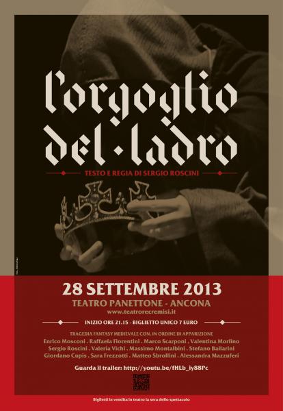 ? L'orgoglio del ladro ? Testo e regia di Sergio Roscini 28 settembre 2013 Teatro Panettone / Ancona http://www.teatrorecremisi.it/pagina.asp?pag=60 Inizio ore 21.15 / Biglietto unico 7 euro Guarda il trailer: http://youtu.be/fHLb_iy88Pc Partecipa all'evento su Facebook: https://www.facebook.com/events/565365806831820/?fref=ts -?-?-?-?-?- Tragedia fantasy medievale con, in ordine di apparizione: Enrico Mosconi, Raffaela Fiorentini, Marco Scarponi, Valentina Morlino, Sergio Roscini, Valeria Vichi, Massimo Montalbini, Stefano Ballarini, Giordano Cupis, Sara Frezzotti, Matteo Sbrollini, Alessandra Mazzuferi -?-?-?-?-?- Un infame piano sta per compiersi mettendo in pericolo il neonato successore al trono e segnando per sempre il destino di due regni. Parole di vendetta riecheggiano nell’aria, riesci a sentirle? “Ognuno è libero di scegliersi il proprio abito. Ma lo scelgono o troppo largo o troppo stretto. L’importante è che ci soffochino dentro” S.V. -?-?-?-?-?- Con lo spettacolo "L'orgoglio del ladro" nasce la compagnia Petite Lumière con l'intento di portare giovani a teatro con spettacoli pieni di passione e movimento. Per questa volta abbiamo un fantasy medievale d'influenza shakespeariana. -?-?-?-?-?- Si ringraziano i volontari del Telefono Azzurro in particolar modo Arnaldo, Pamela, Serena e Ambra Micciarelli, Gianfranco Frelli, Michele Ceppi e il Gruppo delle Perle. -?-?-?-?-?- Biglietti in vendita in teatro la sera dello spettacolo