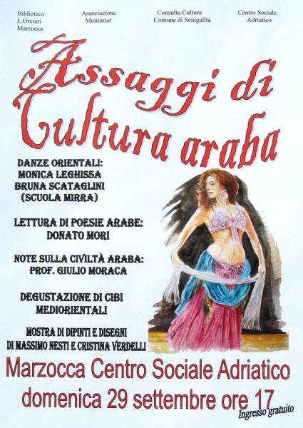 Assaggi di cultura araba Domenica 29 settembre alle ore 17 nell’ex cinema “Adriatico” di Marzocca l’Asociazione Montimar in collaborazione con la biblioteca “L. Orciari” e il Centro Sociale “Adriatico” offrirà un assaggio di cultura araba. Durante l’evento il pubblico avrà l’occasione di ascoltare dalla voce di Donato Mori alcune antiche poesie arabe tradotte in italiano, di lasciarsi coinvolgere dalla sensualità e dall’armonia delle danze orientali eseguite da Monica Leghissa e Bruna Scataglini della scuola Mirra (che tengono corsi a Marzocca, Senigalllia, Cesanella e Ancona), di apprendere dal prof. Giulio Moraca notizie sulla civiltà araba nel suo percorso storico e, infine, di assaggiare alcuni cibi della tradizione medio-orientale, il tutto corredato da abiti ed elementi scenografici tipici, nonché dall’esposizione di dipinti e disegni di Massimo Nesti e Cristina Verdelli (che insegnano pittura, disegno, grafica, illustrazione e fumetto nel loro laboratorio nvart a Senigallia in via Verdi 156 www.nvart.it).