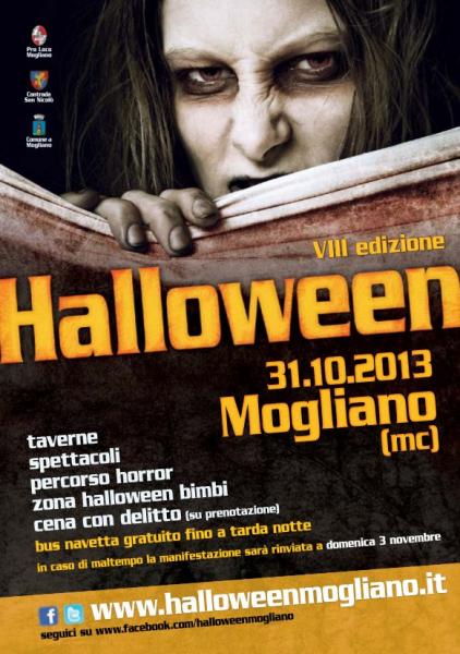 Giovedì 31 ottobre su Mogliano (MC) cala inesorabile la notte di Halloween! Streghe, spiriti e signori delle tenebre per trascinarti in piazza in un percorso da brivido nel centro storico pieno di attrazioni, musica, spettacoli, e tanto divertimento per i bambini! Dalle ore 18.00 apertura della ZONA HALLOWEEN BIMBI appositamente pensata per i più piccoli e le famiglie (a prova di passeggino e separata dal percorso horror!) con giochi, gonfiabili, truccabimbi, scultori di palloncini, sorprese e tanto divertimento! Dalle ore 19.00 apertura delle TAVERNE. Chi si sente un investigatore nato può cimentarsi nella CENA CON DELITTO e provare ad individuare il colpevole (solo su prenotazione. I posti sono limitati per cui affrettati!) Dalle ore 21.00 apertura del PERCORSO HORROR che si snoda tra i tortuosi vicoli del centro storico in una atmosfera da brividi con tante attrazioni. Inizio degli SPETTACOLI con artisti di strada e MUSICA fino a tarda notte. Ingresso € 5 - gratuito per i bambini sotto i 10 anni. Il programma è disponibile nel sito www.halloweenmogliano.it.