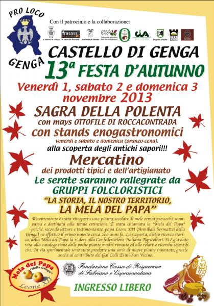 Come ogni anno, si rinnova l’appuntamento con la “Festa d’Autunno”, all’interno delle splendide mura di Genga Castello. Giunta ormai alla tredicesima edizione, quest’anno la manifestazione perdurerà per ben tre giorni: Venerdì 1, Sabato 2 e Domenica 3 Novembre 2013. Fin dalle ore 10:00 del Venerdì il Centro Storico di Genga, perla turistica dell’entroterra montano, si animerà con la presenza degli espositori partecipanti alla Mostra Mercato dei Prodotti Tipici e dell’Artigianato. Contestualmente funzioneranno gli stand eno-gastronomici della “Sagra della Polenta”, aperti nei tre giorni sia a pranzo che a cena. Dalle cucine saranno sfornati succulenti menù tipici di questa stagione, come la già citata polenta, il cinghiale, la buonissima crescia e tanto altro ancora. Ad allietare i gengarini, turisti e curiosi , che come solito accorrono numerosissimi alla “Festa d’Autunno”, ci saranno per tutte e tre le serate altrettanti gruppi folcloristici. Altre peculiarità di questa “tre giorni” organizzata dalla Pro Loco di Genga saranno: l’apertura del Museo di Arte Sacra e gli ormai immancabile momenti dedicati alla “Mela del Papa”, la famosa mela autoctona di Genga: Venerdì 1, dalle ore 15:30, verrà tenuto un convegno sulle “metodologie di coltivazione e di produzione della mela” e al termine dell’incontro è prevista la consegna delle piantine di Mela del Papa a tutti coloro che ne abbiano fatto precedente richiesta. Per la buona riuscita della manifestazione sono stati essenziali i patrocini del Comune, del Consorzio Frasassi, della Regione Marche, della Provincia di Ancona, della Comunità Montana dell’Esino Frasassi, del Parco Gola della Rossa e di Frasassi, della CIA di Ancona e dei Colli Esini. Un ringraziamento particolare va alla Fondazione della Cassa di Risparmio di Fabriano e Cupramontana. Sarà un percorso sia culturale sia alla scoperta degli antichi sapori, con la Mostra Mercato dei Prodotti Tipici e dell’Artigianato e le succulenti degustazioni dei piatti tipici locali, accompagnati dalle esibizioni dei gruppi folcloristici. Vi aspettiamo!!!