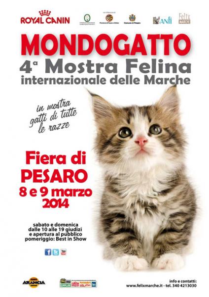 La Mostra Internazionale Felina delle Marche “MONDOGATTO” si tiene per la seconda volta a Pesaro, dopo l’edizione di grande successo del 2012, che ha registrato oltre 10.000 presenze di pubblico e oltre 300 gatti in mostra provenienti da tutta Italia.