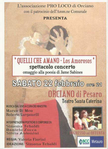 Spettacolo musicale-teatrale organizzato dalla PRO LOCO di Orciano di Pesaro con il patrocinio dell'Amm.ne Comunale di Orciano. Omaggio alla poesia di Jame Sabines con la musica dal vivo di Marco Di Meo e Roberto Gargamelli. Le interpretazioni poetiche e corporee sono di Simona Tebaldi, Daniele Zucca e Silvia Antonini. Regia di Valeria Fiorini. Ideazione di Simona Tebaldi. Ingresso ad OFFERTA.