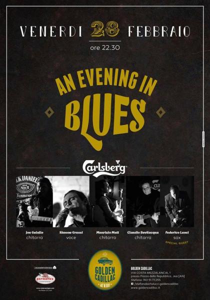 In cartellone ,per il Golden Cadillac Music live di Jesi (AN), arriva venerdi 28 febbraio la grande musica con : An Evening in Blues Joe Galullo-chitarra Simone Grassi -voce Maurizio Matt -chitarra Claudio Bevilaqua-Chitarra Federico Lenci -sax special guest facendoci riscoprire pagine immortali della tradizione ... Un lungo blues che attraversa i secoli, un lungo abbraccio acustico, intimo e prezioso per una serata indimenticabile .! Vi aspettiamo