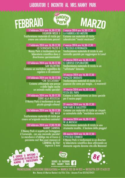 Laboratori creativi a cura del "Nanny Park" dedicati ai bambini dai 3 ai 6 anni di età. I laboratori sono tutti i mercoledì (e ripetuti il giovedì!) e tutti i venerdì, dalle ore 16,30 alle 17,30. Il costo di ogni singolo incontro è di 8 euro.
