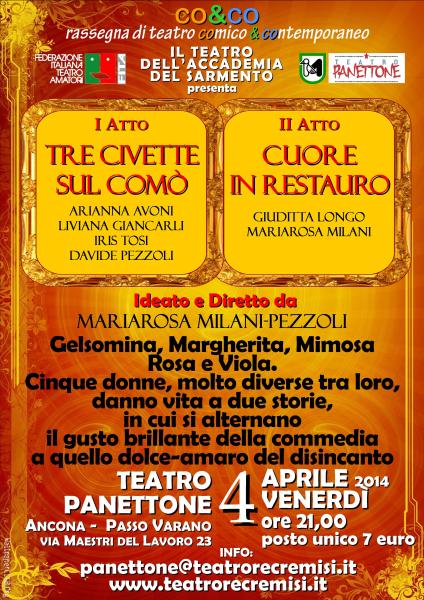 Nell'ambito della Rassegna di Teatro COmico & COntemporaneo CO&CO che si svolge al Teatro Panettone di Ancona organizzata dal Gruppo Teatrale Recremisi di Ancona e Patrocinata dalla Regione Marche, FITA Marche e Comune di Ancona,