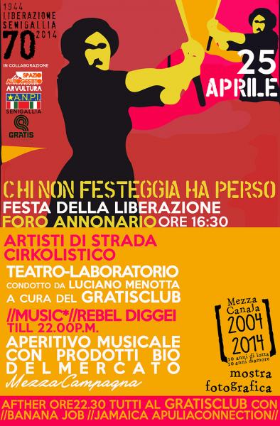 VENERDI' 25 APRILE ORE 16,30 PRESSO FORO ANNONARIO: "Chi non festeggia ha perso! Festa della Liberazione". In collaborazione con Ass. A.N.P.I., Ass. Gratisclub e Arvultura. Artisti di strada, teatro, musica, mostra fotografica e aperitivo con i prodotti biologici del Mercato Mezza Campagna.