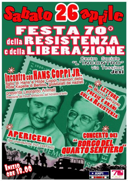 Sabato 26 Aprile 2014 l’Anpi ha organizzato la Festa per celebrare il 70° anniversario della Resistenza e della Liberazione, si svolgerà presso il centro sociale “l’Incontro”, in via Tessitori 2 bis a Jesi (di fronte alla palestra Carbonari). Avrà inizio alle 18.00 con l’incontro con Hans Coppi Jr, figlio di Hans e Hilde Coppi, La festa proseguirà con le letture di poesie e brani della Resistenza da parte di Milena Gregori, con un “apericena” e, a seguire, il concerto del gruppo “ Borgo del quarto sentiero”. Saranno presenti i banchetti delle Associazioni con l’ANPI da anni collaboriamo. Sarà un’ occasione per festeggiare insieme!