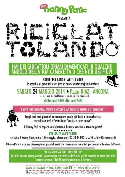 Hai dei giocattoli ormai dimenticati in qualche angolo della tua cameretta o che non usi più?! Partecipa a RICICLATTOLANDO, lo scambio di giocattoli usati (ma in buone condizioni) tra bambini! sabato 24 maggio 2014 (o in caso di maltempo domenica 25 maggio) dalle ore 16.00 alle 19.00 in Piazza Diaz "USATO non significa brutto e vecchio ma ricco di storia e di emozioni!" Scegli tra i tuoi giocattoli da scambiare quello più bello e impacchettalo; parteciperai così all'estrazione "un gioco come nuovo"! Il Nanny Park vi aspetta con laboratori di riciclo creativo e tante sorprese! PARTECIPA ALL'EVENTO! contatta il Nanny Park, entro il 20 maggio, al numero 333 5844835 o scrivi a: info@mrsnanny.it Il Nanny Park si occuperà di raccogliere i giocattoli usati, che non saranno scambiati, per donarli ai bambini del Salesi. "LE PATRONESSE CHIEDONO AIUTO!" In tal occasione sarà presente l'associazione Patronesse del Salesi per la raccolta di firme contro lo spostamento dell'Ospedale pediatrico a Torrette.