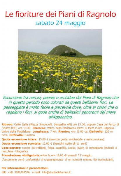 Ritrovo: Caffè Italia (Piazza Simoncelli, Senigallia AN) ore 13:30, oppure Casa del Parco di Fiastra (MC) ore 15:30. Percorso: Valico della Maddalena-Pizzo di Meta-Punta Ragnolo-Valico della Maddalena. Lunghezza: 7km. Rientro:ore 19.00 ca. Dislivello:120 m circa. Difficoltà:turistico