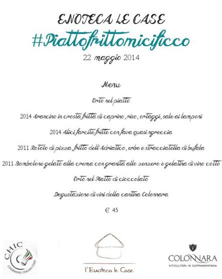 Giovedì 22 maggio dedicheremo il secondo evento del 2014 al fritto. Lo chef Michele Biagiola ha ideato un menù di sei portate servite nel contesto intimo ed elegante de L'Enoteca Le Case. L'alta cucina incontra una delle più longeve tradizioni gatronomiche locali, dando vita ad una esplosione di gusti, sapori e creatività. È gradita la prenotazione, i posti sono limitati