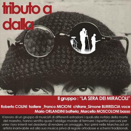 Nell'ambito del Festival della musica europea, a Senigallia musica dal vivo in ogni piazza, la band LA SERA DEI MIRACOLI offre un tributo a Lucio DALLA dal vivo nella piazza principale della città. ingresso LIBERO.