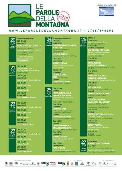 LE PAROLE DELLA MONTAGNA LUOGHI/POESIA/FILOSOFIA/ESCURSIONI/ARTE/RACCONTI/SPETTACOLI V EDIZIONE DAL 20 AL 27 LUGLIO 2014 LA FILOSOFIA DEL FESTIVAL Il Festival è un contenitore di incontri, poesia, escursioni, musica e spettacolo, arte, convivialità, sul tema della sacralità della montagna. La manifestazione, infatti, vuole dare voce alla montagna che parla non solamente di escursionismo, natura, conquista di vette, ma parla anche un linguaggio simbolico ricco di significati trascendenti. Nella tradizione di tutte le culture, infatti, la montagna si è presentata quale dimora allegorica di nature divine ed eroi, ambientazione di miti, luogo di unione tra il cielo e la terra. La stessa forma geometrica della montagna, questo triangolo proteso verso l’alto, è stata interpretata simbolicamente, fin dalle culture più antiche, quale luogo di incontro fra l’umano ed il divino. L’altezza poi, la maestosità, la visuale così ampia, l’inaccessibilità producono sensazioni ed emozioni, che non si limitano alla percezione meramente fisica, ma scuotono l’anima facendosi occasione di meditazioni interiori. L’ascensione alla vetta si riempie, così, di un nuovo significato che va ben oltre il concetto di conquista, intesa come appropriazione, impossessamento. La salita alla vetta quale mera prova di forza, affermazione delle proprie capacità, è un’esperienza che appare destinata ad esaurirsi nel breve termine, poiché quando tutte le vette saranno conquistate, si correrà il rischio, per poter vivere nuove emozioni, di dover sfidare le pericolosità, dare prove di eroismo, in una sorta di paradigma superomistico, quasi nel desiderio di abbassare le montagne e non più di ascenderle. L’esperienza di montagna, invece, simbolicamente intesa quale scalata della propria Montagna Sacra, verso l’incontro con sé stessi ed il trascendente, è un cammino inesauribile. Il Festival, sottolineando i significati simbolici dell’esperienza di montagna, propone così, unitamente alle escursioni che diventano esperienza personale dell’ascendere, riflessioni sull’Uomo nel suo cammino interiore. I LUOGHI DEL FESTIVAL Il Festival si svolge a Smerillo un piccolo Borgo medievale nelle Marche, in provincia di Fermo. Arroccato su un crinale roccioso proprio sotto i leopardiani Monti Azzurri, con le sue case in pietra, i vicoli silenziosi, Smerillo è il paese delle illimitate vedute panoramiche, degli ampi spazi e dei silenzi che offrono spunto di riflessione. Con una popolazione di neppure 400 anime, di cui solamente 50 residenti nel borgo, Smerillo ospita l’essenziale. Dove c’è poco di solito c’è moltissimo. Smerillo, infatti, è un luogo fuori dal tempo, dove non si compra e non vende nulla, dove vi è ancora la possibilità di apprezzare antichi valori e tradizioni popolari e magari, perdendosi nei panorami sconfinati, incontrare sé stessi. Per la sua particolarità, Smerillo è il luogo della comunicazione vera, dove le parole riacquistano significato e diventano più leggere. Il piccolo Borgo è da tempo divenuto “Cittadella della Poesia”, punto di incontro di poeti e persone di cultura che vogliono lanciare, da questa piccola realtà, un messaggio culturale forte. Le escursioni vengono organizzate nei luoghi più inesplorati dei Monti Sibillini, luogo di ambientazione di tante leggende dal sapore magico, che conferiscono al territorio un fascino particolare. IL PROGRAMMA DEL FESTIVAL Il programma del Festival è diviso in sezioni: [parentesi] sezione dedicata alla poesia [parole] sezione dedicata alla comunicazione del pensiero [immaginario] sezione delle arti e spettacolo [esperienza] sezione delle escursioni in montagna ed ai laboratori [Festival del bambini] sezione speciale dedicati ai bambini Ogni giornata del Festival, viene introdotta da una parentesi di poesia, versi e parole sul tema scelto, per aprire l’animo e predisporlo ad una amplificata percezione sensoriale di tutto quello che verrà nel resto della serata. A seguire, il pensiero dei relatori sul tema scelto. Vengono coinvolti illustri relatori, scelti fra filosofi, letterati, uomini di cultura e di spessore umano e spirituale, di prestigio non solo nazionale. Gli spettacoli chiudono ogni serata, con raffinate proposte di musica, teatro e danza. Nella sezione dedicata alle arti e spettacolo, è previsto l’allestimento di mostre di opere d’arte. Particolare rilievo hanno le escursioni montane, organizzate con la collaborazione della Sezione di Amandola del CAI e destinate a scoprire luoghi pochi conosciuti, che permettono un’esperienza personale di ascesa alla vetta e nel contempo promuovono le meraviglie paesaggistiche dei Monti Azzurri. Durante le escursioni sono previsti spettacoli teatrali e reading sul tema scelto, in suggestive ambientazioni montane. Sono organizzati laboratori (fotografia, video, poesia e scrittura, meditazione) per permettere ai partecipanti di divenire protagonisti delle giornate del Festival. All’interno del calendario, sono concepiti momenti di convivialità e degustazione di prodotti tipici, con il duplice vantaggio di proporre momenti di aggregazione, anche con i protagonisti della serata, e contestualmente promuovere e salvaguardare le tipicità del territorio. Particolare attenzione è riservata alla sezione speciale [Festival dei bambini], una sezione dedicata ai più piccoli, che vengono coinvolti in laboratori ed escursioni, con annesso intrattenimento teatrale. Al Festival sono abbinati concorsi a premi di fotografia e di scrittura, aperti a tutti, sul tema scelto ogni edizione. Durante il Festival, viene allestito nel Borgo di Smerillo un mercatino di libri specifici sulla montagna, attrezzature e materiale per escursioni ed arrampicate montane, nonché prodotti tipici del territorio. Si organizza, inoltre, per tutta la durata del Festival, un Passalibro - Bookcrossing, condivisione gratuita di libri fra amanti della lettura, per liberare i libri e farli circolare