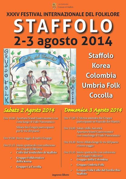 Un appuntamento che ravviverà come da tradizione l’estate staffolana. Ospiti dei Musicisti e Ballerini Folkloristici del Colle del Verdicchio di Staffolo, saranno quest’anno i gruppi Folkloristici: della Korea, La Cocolla di Mogliano di Macerata, della Colombia e Umbria Folk di Panigale di Perugia. La kermesse prevede altresì la sfilata e il saggio dei gruppi per le vie del centro storico e la messa all’aperto animata dai colori e dai canti dei gruppi Immancabili, ovviamente, gli stand gastronomici. Il Gruppo Folklorico “Colle del Verdicchio” è nato a Staffolo nel 1971 per di divulgare e diffondere balli e canti della tradizione contadina locale, strenuamente legata all’abbondante e pregiata produzione di Verdicchio.