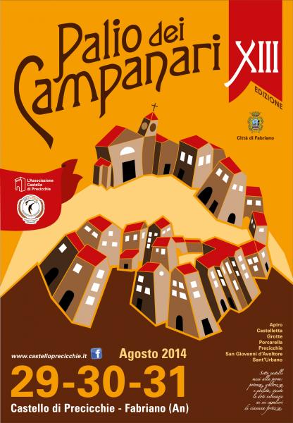 Palio dei Campanari Castello di Precicchie, 29 31 agosto 2014 XIII Edizione Nel suggestivo palcoscenico di Precicchie la gloria e l'onore di 7 castelli verranno messi in gioco. Potenza, scaltrezza e abilità, queste le doti necessarie ai cavalieri di ciascuna fortezza. PROGRAMMA VENERDI' 31 AGOSTO 2014 19.00 Apertura mostre fotografiche Apertura degli "Angoli del gusto" per l'assaggio di arrosticini della Porta e altre specialità Apertura hosterie e stand gastronomici Giochi popolari: mazzafionda e 'cciaccanoce (gli spettatori potranno mettere alla prova la propria abilità) 21.00 Gara di briscola SABATO 30 AGOSTO 2014 17.00 "La contesa del dolce" Sfida a suon di dolci tra le dame dei sette Castelli Apertura hosterie e angoli del gusto Apertura mostre fotografiche Laboratorio della carta a mano a cura dei Mastri Cartai del Museo della Carta e della Filigrana di Fabriano Giochi popolari: mazzafionda e 'cciaccanoce (gli spettatori potranno mettere alla prova la propria abilità) Truccabimbi "Le Fate Trucchine" 18.15 Premiazione vincitori "La contesa del dolce" 18.30 Bernabeo e Donna Olimpia salutano gli atleti dei sette castelli Inizio della sfida tre i sette Castelli: Staffetta con le brocche (1a sfida) - Sfida delle chiavi (2a sfida) 20.00 Cena insieme 21.00 Corsa coi sacchi (3a sfida) - Segò (4a sfida) 22.00 Combattimenti medievali con spade e fuoco - Compagnia della Buona Morte 22.30 "Emozioni di fuoco", giocoleria con il fuoco - Infusio Vulgaris Offagna 23:00 "If I Were A Bell" Orchestra Concordia (Fabriano) direttore M° Marco Agostinelli 23.00 Bisboccia dei Campanari nella Piazza del Campanile DOMENICA 31 AGOSTO 2014 Festa della Madonna delle Grazie 11.00 Santa Messa e processione per le vie del castello 13.00 Pranzo al Castello su prenotazione (per info e prenotazioni telefonare a Lucia 349 5300732 - Serena 349 1070673) 17.00 Apertura hosterie e angoli del gusto Apertura mostre fotografiche Laboratorio della carta a mano a cura dei Mastri Cartai del Museo della Carta e della Filigrana di Fabriano Giochi popolari: mazzafionda e 'cciaccanoce (gli spettatori potranno mettere alla prova la propria abilità) Truccabimbi "Le Fate Trucchine" Bernabeo e donna Olimpia, signori di Precicchie, accolgono i rappresentanti dei sei castelli SFIDA DEI CAMPANARI 18.30 Spettacolo di Falconeria "I Falconieri di Federico II" 20.00 Cena insieme 21.00 Combattimenti medievali con spade e fuoco - Compagnia della Buona Morte 21.30 Spettacolo teatrale "Sette mariti per sette zitelle" Compagnia di Argignano e Attiggio 23:00 Bisboccia dei Campanari nella Piazza del Campanile ------------- L'ingresso agli eventi-spettacolo è gratuito Per motivi organizzativi il programma potrà subire variazioni Funzioneranno stand gastronomici con prodotti tipici locali (tagliatelle al ragù, tagliatelle con fave e finocchio selvatico, polenta, castrato, grigliata mista, zampetti di maiale al finocchietto e molto altro ancora...)