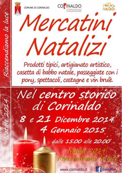 Mercatini natalizi a Corinaldo, con artigianato artistico e prodotti tipici, sotto il loggiato del Palazzo Municipale e lungo Via del Corso, dalle ore 15 alle ore 20.