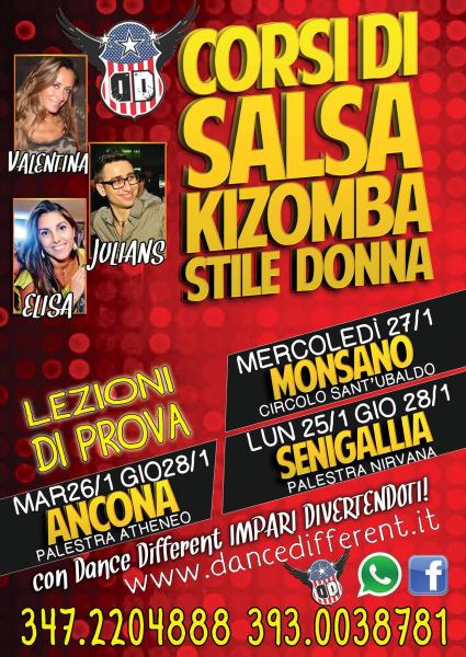 ***** Dance Different vi invita alla nuova stagione di CORSI! *****Dance Different tutta la vitaIMPARA DIVERTENDOTI CON NOI E TUTTI I NUOVI AMICI CHE TROVERAI***** SALSA PORTORICANA *****New York style, pachanga, cha cha, boogaloo, bachata***** KIZOMBA *****Movimento, isolazioni, ritmo, figure***** LADIES STYLE *****Tecnica body isolation, vuelte spin e interpretazione musicaleTrova la tua femminilità e il tuo stile con tecnica e passione***** LATINO 360° *****Organizzatori di Serate ed Eventi latini con Animazione e Stage Bachata, merengue, balli di gruppo, reggaeton***** FITNESS *****In Esclusiva con noi "SAMBAFIT"(il nuovo allenamento completo e divertente), Zumba, Total DanceLezioni private per Allievi ed Insegnanti***** GARANZIA DI QUALITÀ *****Esperienza ventennale di animazione, insegnamento e partecipazione con spettacoli e stage a congressi nazionali e internazionali , certificazione Kizomba Italia dal 2013.Guarda i nostri C.V. su www.dancedifferent.it - la professionalitá si trasmette da insegnante ad allievo, con passione e tecnica ;)<<<< ORARI PRESENTAZIONI >>>>Lunedì - Nirvana - SENIGALLIA (dal 25/1)20.45 Salsa (principianti) NEW21.30 Kizomba (principianti) NEWMartedì - Atheneo - Ancona (dal 26/1)20.45 Salsa (intermedi)21.30 Kizomba (base 2)22.15 Salsa (base 2)Mercoledì - S. Ubaldo - Monsano (dal 27/1)20.45 Kizomba (base) NEW21.30 Kizomba (intermedi)22.15 Salsa (intermedi)Giovedì - Atheneo - Ancona (dal 28/1)20.30 Salsa (base) NEW21.15 Gestualità Femminile (open)Giovedì - Nirvana - SENIGALLIA (dal 28/1)20.45 Salsa (base 2)21.30 Kizomba (base 2)Info 347.2204888 393.0038781www.dancedifferent.it