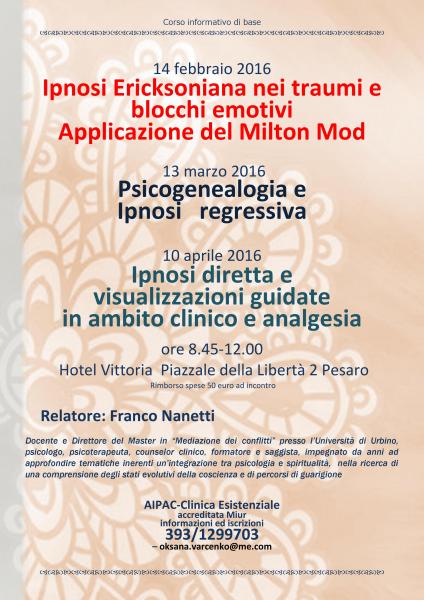 14 febbraio 2016 dalle ore 8.45 alle ore 12.00 presso l’Hotel Vittoria, Piazzale della Libertà 2, Pesaro si terrà l’incontro con Franco Nanetti sul tema: Ipnosi Ericksoniana nei traumi e blocchi emotivi, Applicazione del Milton Mod.