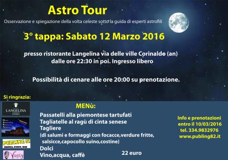 Terza tappa di Astro tour con ingresso libero ed osservazioni stelle e pianeti dalle ore 22:30 con strumenti e spiegazioni di esperti astrofili dell'associazione n.a.s.a. senigallia nell'incantevole giardino del ristorante Langelina di corinaldo.
