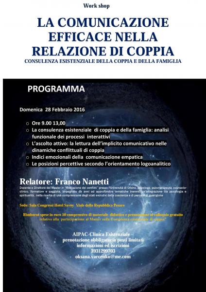 28 febbraio 2016 dalle ore 9.00 alle ore 13.00 presso l’Hotel Savoy (Viale della Repubblica 22, Pesaro) si terrà il workshop con Franco Nanetti sul tema: LA COMUNICAZIONE EFFICACE NELLA RELAZIONE DI COPPIA.